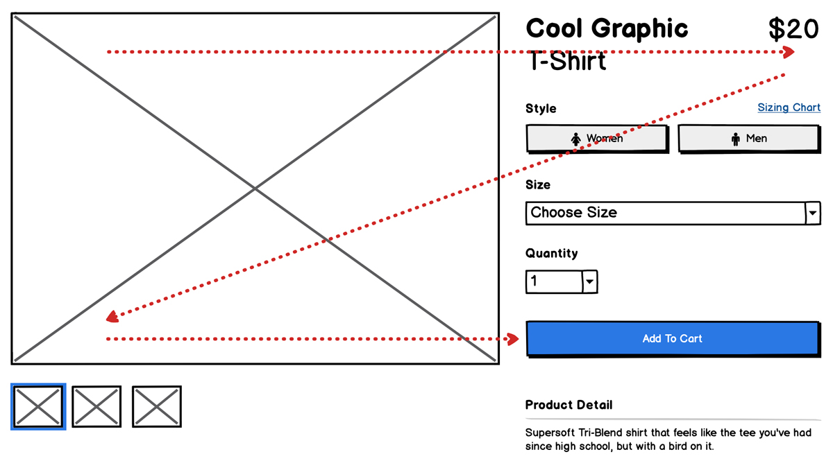 Interestingly, this particular layout is rarely found outside of e-commerce. But it does make sense in its context. We scan content from left to right, then down, then back to left to right. It's called z-pattern scanning, and when shopping it seems to make sense to follow this progression. We first look at the images, which are the most dominant element on the page, then we progress to the right and see the product title and price (among other details), and as we move down, we see a primary action button.