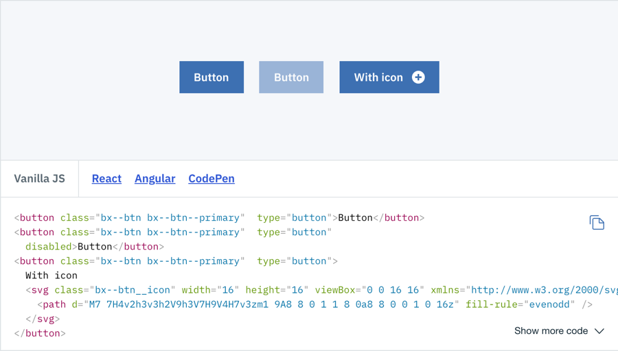 Here is a small piece of the IBM Carbon Design System showing the appearance and code for buttons.