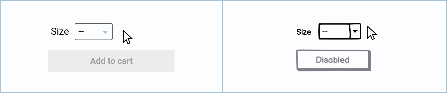 If a user hasn’t completed a form or an event currently isn’t available, the button will appear greyed out, letting the user know that they can’t click it. For example, if a user hasn’t entered their dress size, they shouldn’t be able to buy it, so the button will be disabled.